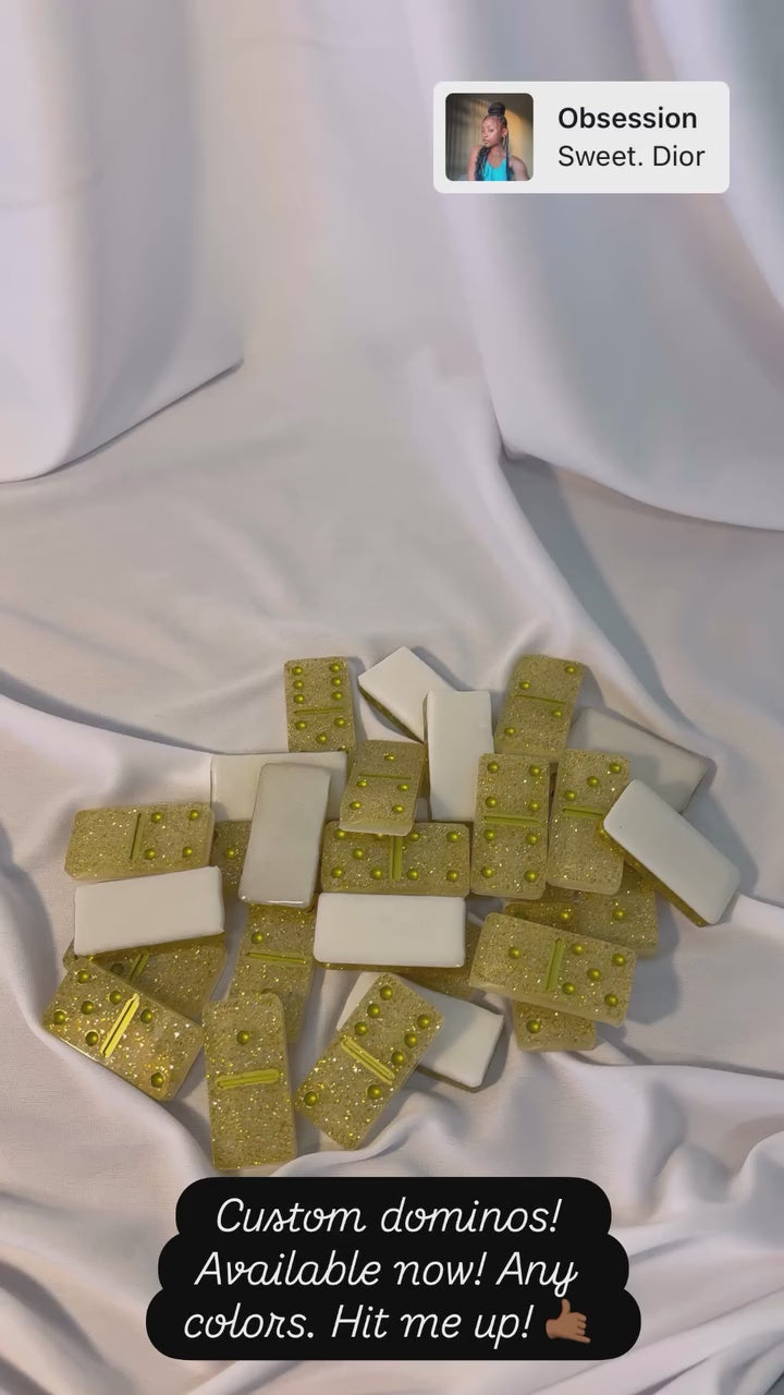 Each resin domino set is hand-poured using high-quality epoxy resin and finished with your choice of colors, glitter, or metallic accents. Every piece is one-of-a-kind — smooth, glossy, and built to last. Whether you prefer a minimalist clear design, bold metallic swirls, or a vibrant two-tone style, your dominoes will be as unique as you are.